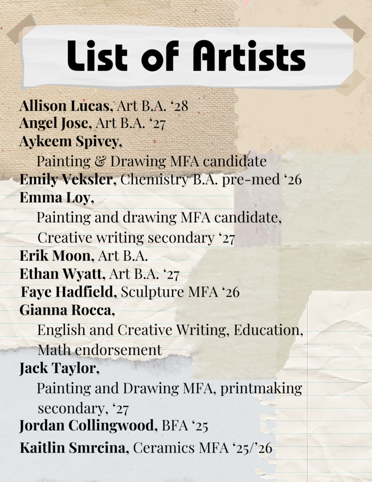 Featuring student work from MFA, BFA, and non-art major students, we offered a gallery guide to accompany the exhibit. This guide was made with the help of UAHS members, each page digitally collaged featuring 3-5 works, as well as a QR code to take visitors to our artist highlight blog post.